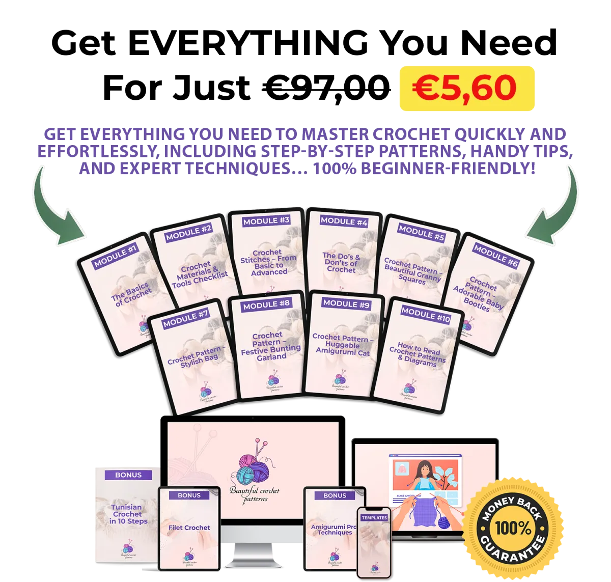 This bundle is designed for anyone who wants to create stunning crochet projects – whether you’re a total beginner, a hobbyist looking to improve, or even an experienced crocheter seeking new inspiration. It’s perfect if you want step-by-step guidance without wasting time or money on patterns that don’t work.